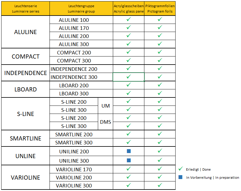 Durch diese Änderungen ist es uns möglich die Ausleuchtung, das Lichtbild und die Übereinstimmung der Piktogramme deutlich zu verbessern. Nachfolgend finden Sie die Übersicht die den Status der jeweiligen Änderung anzeigt.